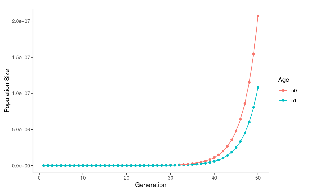 We’ll start with a simplified population of 0 and 1-year olds. In each generation, the number of 1 year olds in the next generation is determined purely by the number of 0 years olds that survive the year, and the number of 0 year olds is determined by the sum of the number 0 year olds and the number of 1 year olds that reproduce.