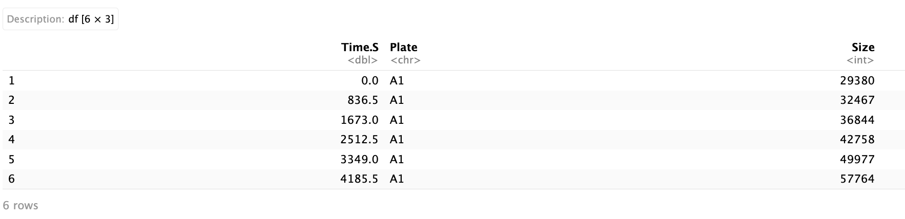 I’ve pulled some data from Yoav et al. 2019, PNAS (https://doi.org/10.1073/pnas.1902217116). This data set tracks microbial growth across a series of plates. Reading in the data:
