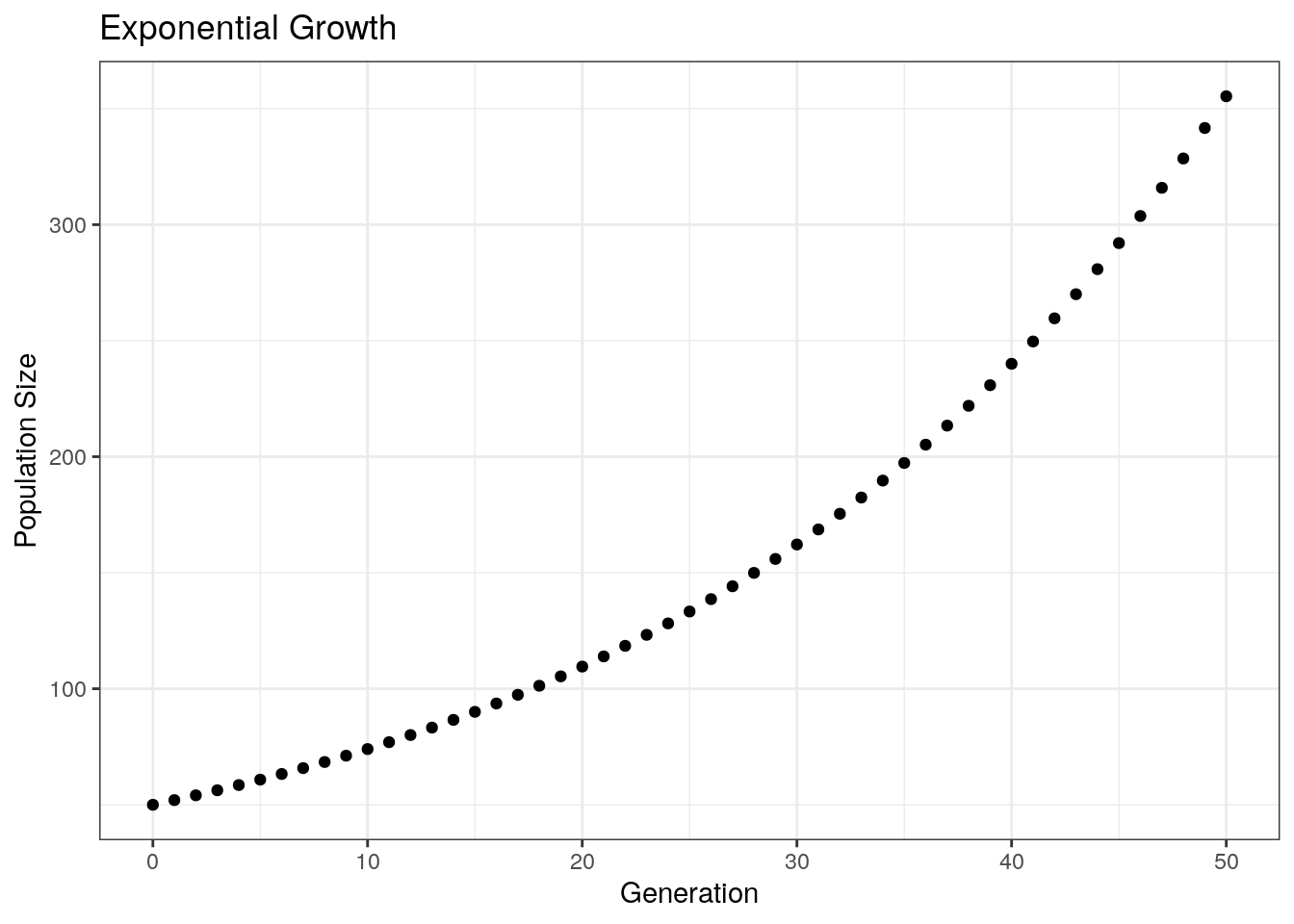 Today, we’re looking at the exponential growth model, which describes how a population grows in the absence of density dependence - that is, when the growth rate doesn’t change in response to population size. First, we’ll plot exponential growth for one population at a given per capita growth rate.