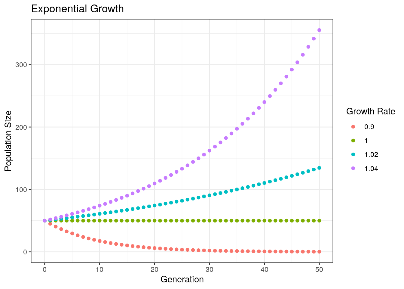 Notice that our population decreases when lambda < 1, stays constant when lambda = 1, and increases when lambda > 1.