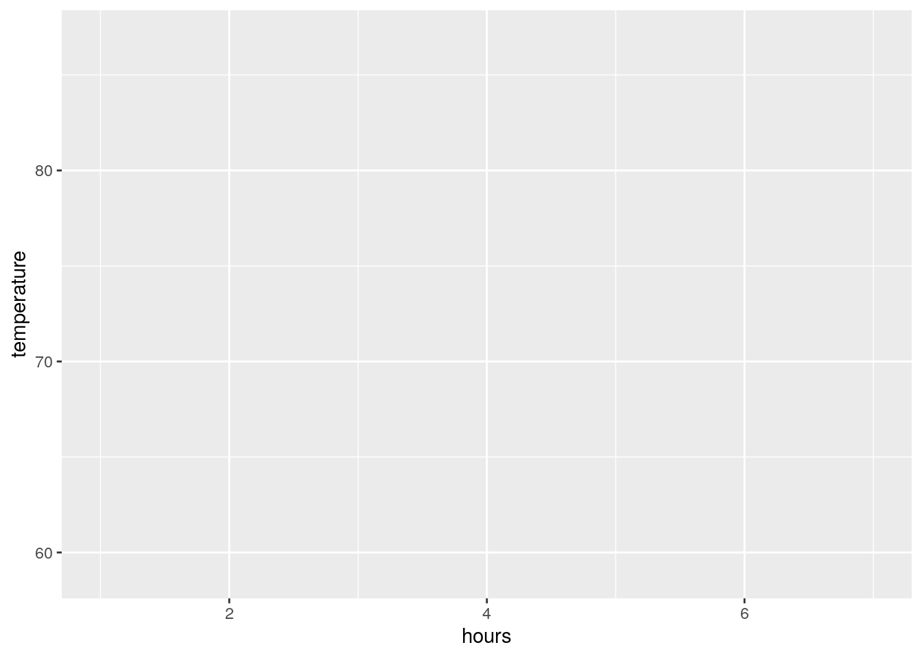 We now have a blank plot with axes. Notice that the scales of our axes are automatically set by the scales of our data (hours ranges from 0 to 7; temperature ranges approximately from 60 to 90).