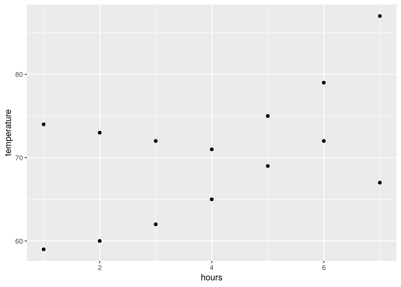 Next, we have to define the axes, groups of data, and other aesthetics. This is done with the aes argument. For our data, it makes sense to have time be the x axis and temperature to be the y axis: