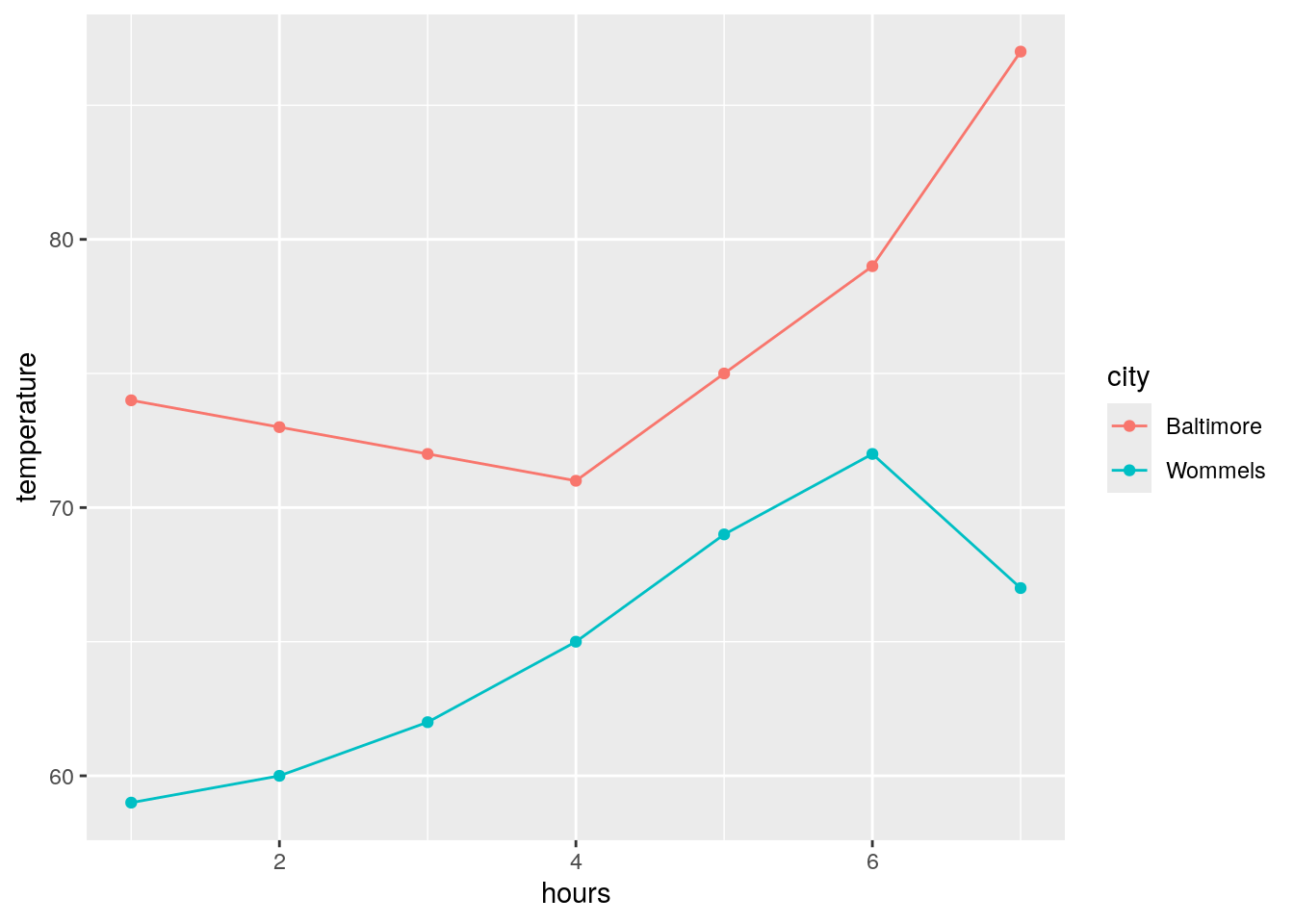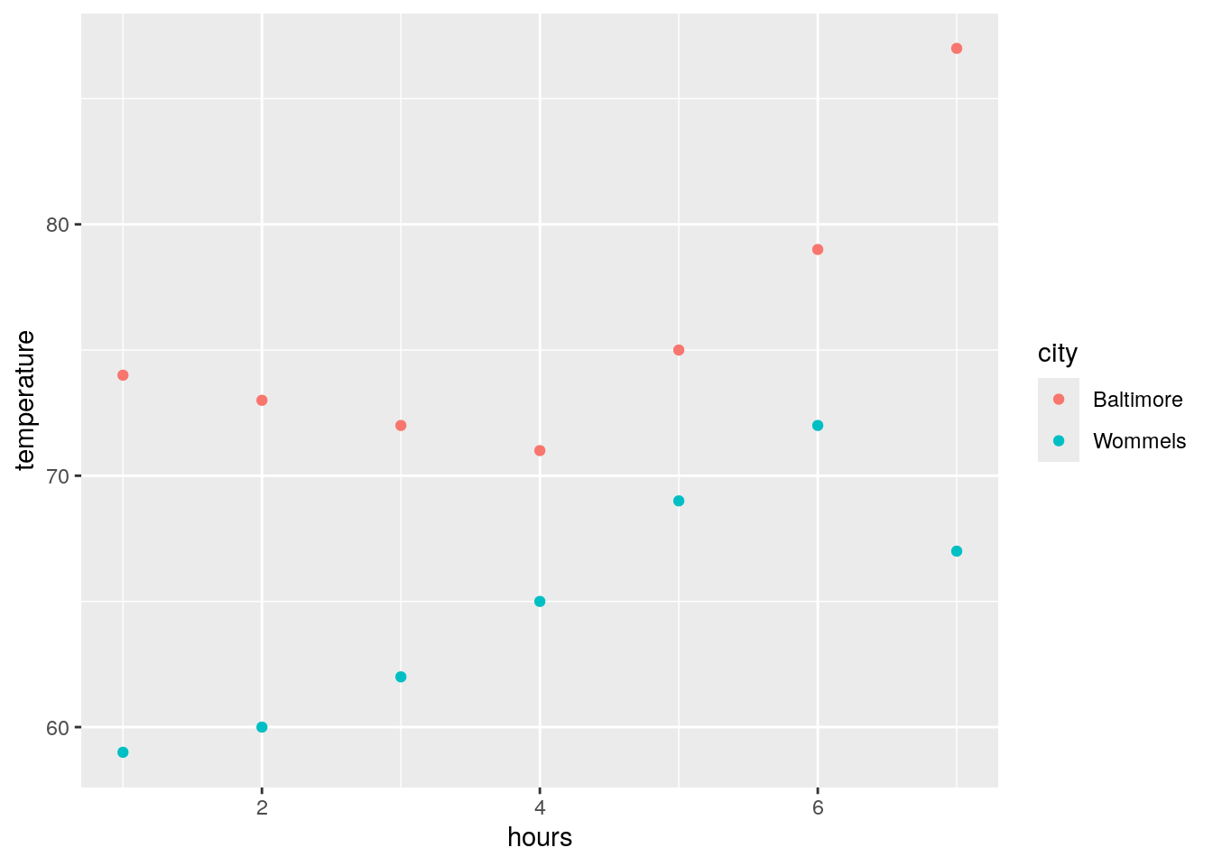 This plots our data correctly, but notice that we can’t distinguish between the two cities visually. We can group our data points by coloring them differently. To do this, we can add another argument (color) to our aes statement: