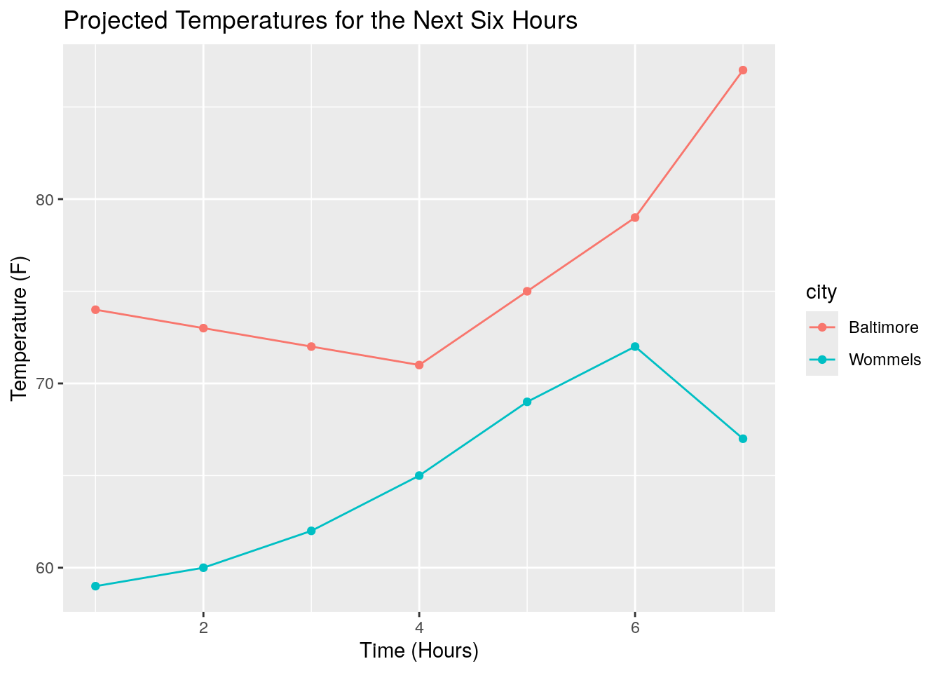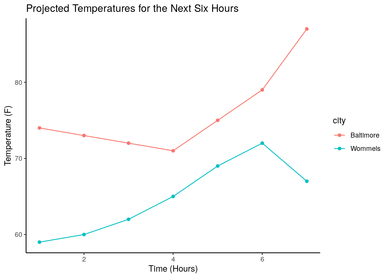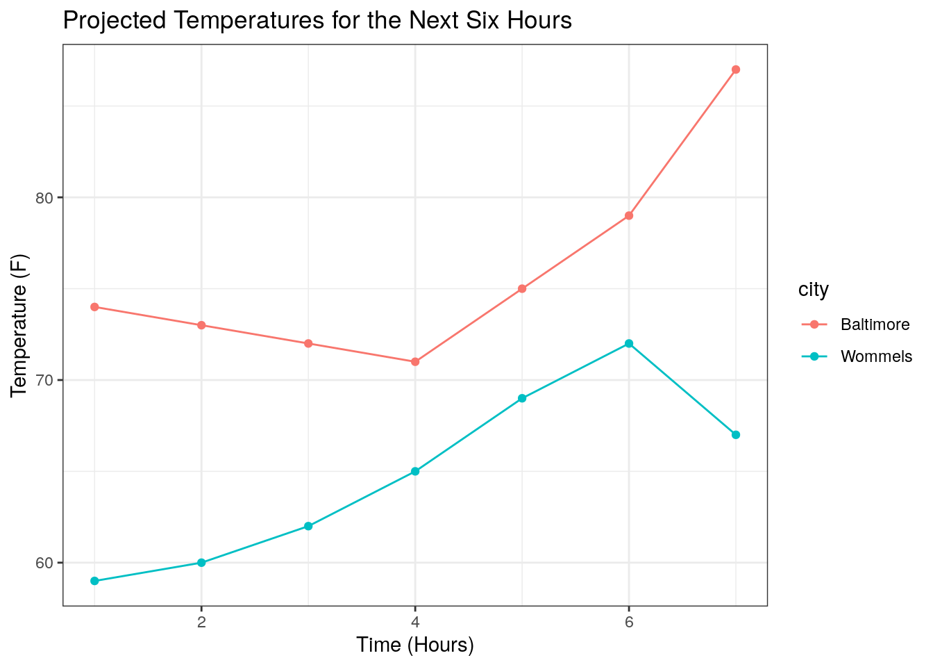 For a simple dataset to plot, I’ve saved the temperature in Fahrenheit in Baltimore, MD and Wommels, Netherlands for the next seven hours: